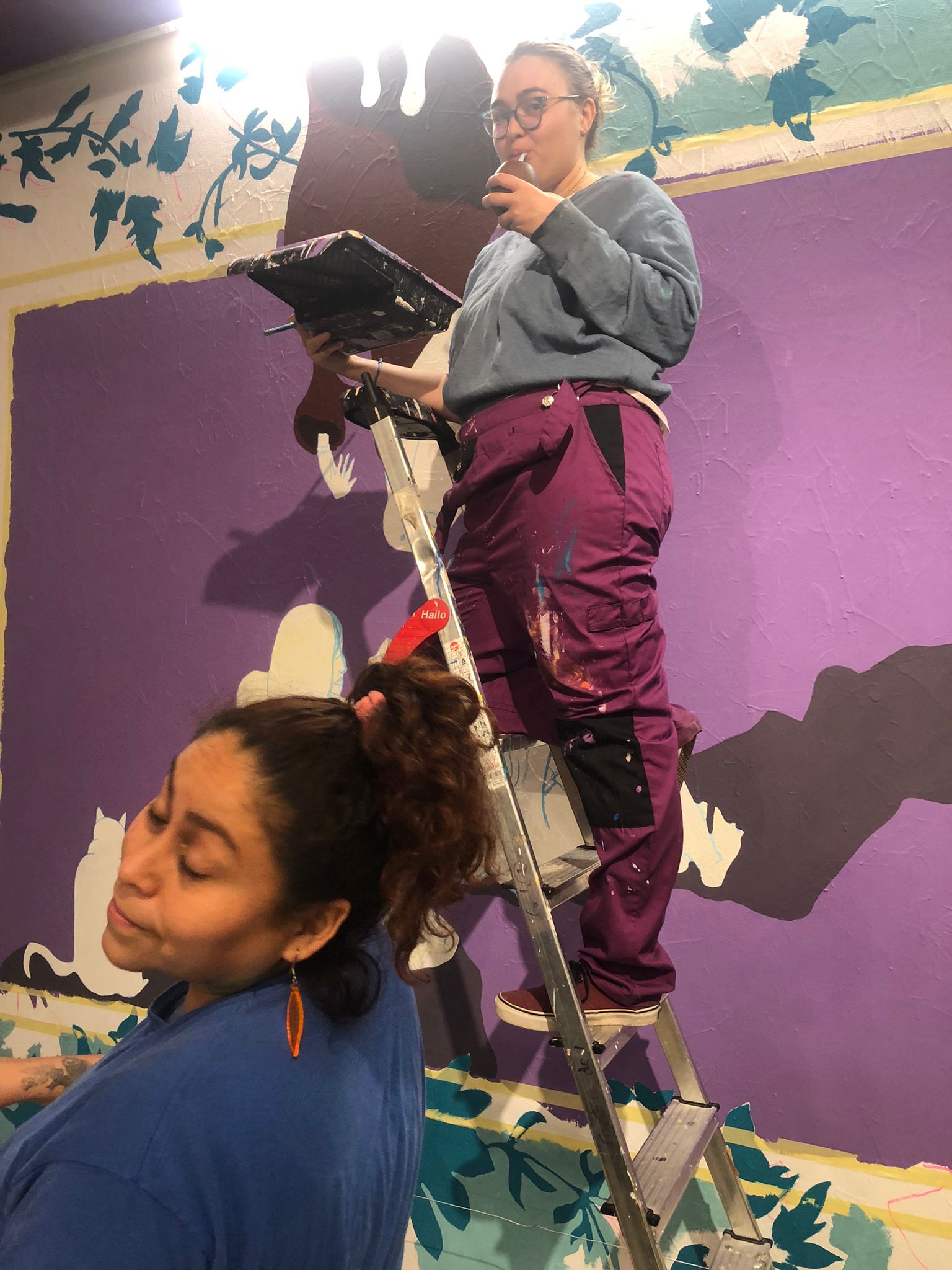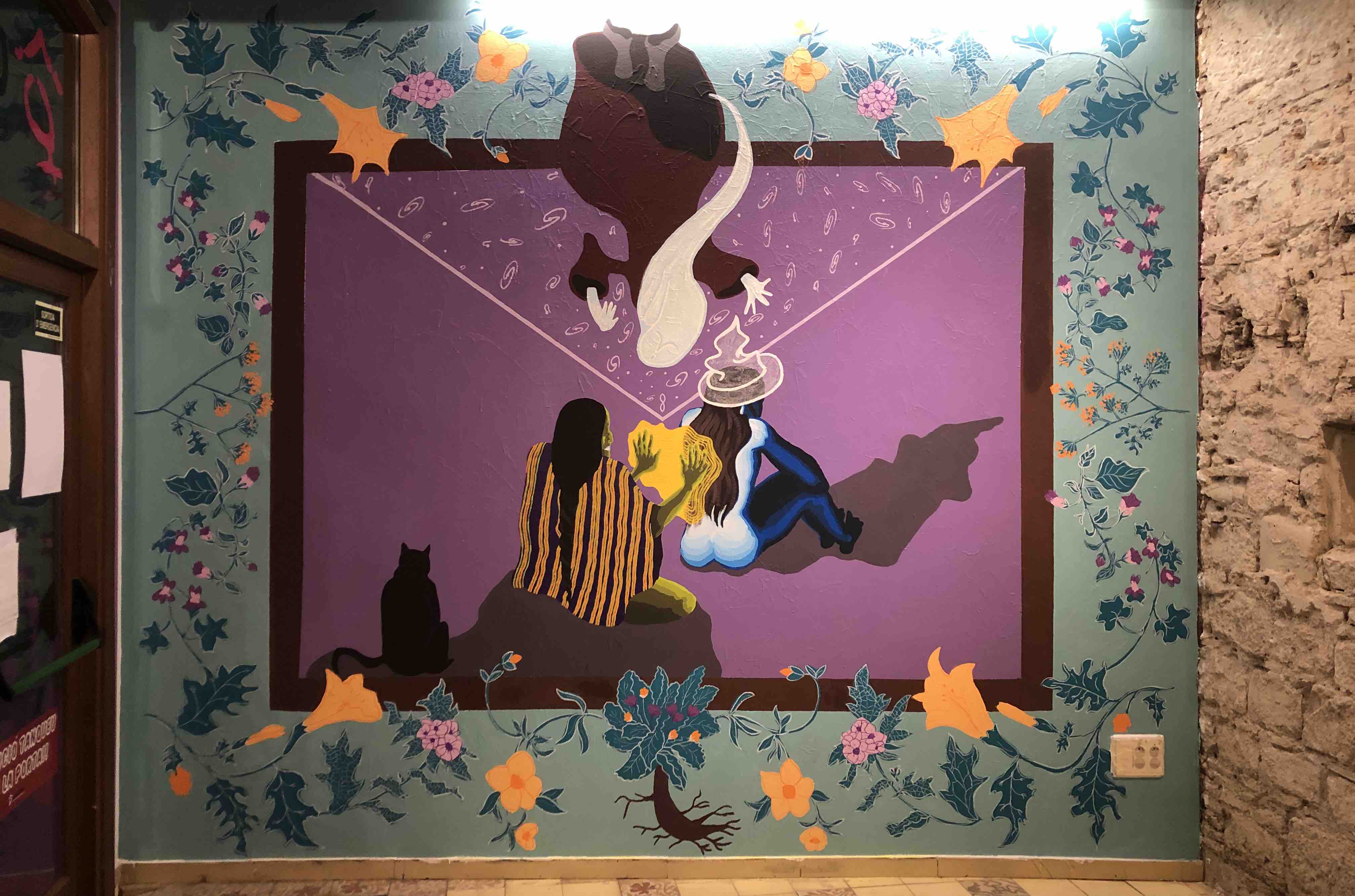 SO- Sí, volíem mostrar l’escena d’un acte de cura entre dues dones, on apareix també una figura fantasma -parafrasejant a Leonora Carrington- que visibilitza la força i la seguretat del llegat de coneixement de les nostres avantpassades..., aquestes dones que, encara que no les veiem, estan al nostre costat dia a dia, que acompanyen els nostres comportaments quotidians. Llavors, decidirem rodejar l’escena amb un marc floral de plantes i flors que s’utilitzaven per fer “remeis”, per practicar avortaments, per curar ...i també per fer mal als maltractadors ...; volíem jugar un poc amb allò que es veu i allò que no es veu, amb alguna referència energètica a partir de la pintura... De fet, en l’obscuritat, el nostra mural mostra figures luminescents, que no es veuen amb llum elèctrica o natural..., sols es veuen en l’obscuritat.